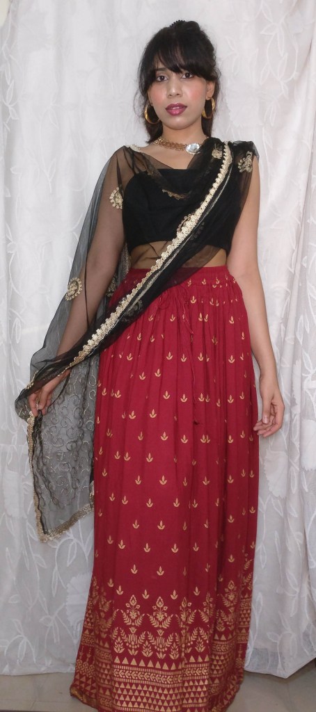 In my third outfit I’m wearing my mom’s accessories, dupatta and ghagra. I really liked the net dupatta and the ghagra which gave a nice traditional look to the outfit. I tried to give a little modern traditional touch to this outfit. The look was to appear MODERN- TRADITIONAL.