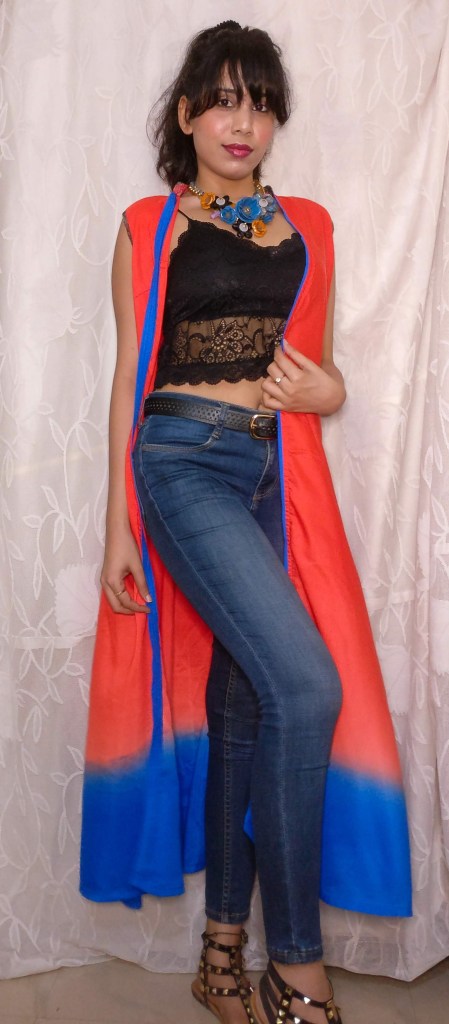 In my second outfit I’m wearing my mom’s cardigan and neckpiece. I paired up my jeans and bralette with my mom’s cardigan to make the outfit look stylish. My mom’s accessory the flower neckpiece just completed the entire look of the outfit. The look was bold enough to make a style statement. The look of the outfit was to appear BOLD.