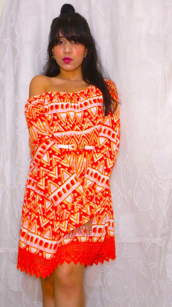 In my first outfit I’m wearing my mom’s orange dress, that’s her favorite dress. I also wore her belt around my waist. I stylized the dress one sided off shoulder because the neckline of the dress was too huge for my body type. The look of the outfit was to appear CUTE.
